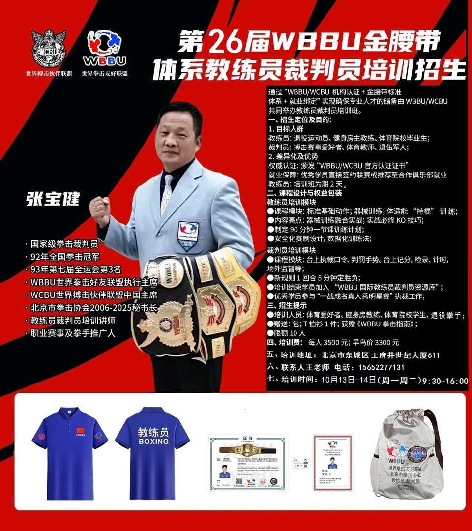 通过”WBBU/WCBU北京市拳击协会机构认证+金腰带标准体系+就业绑定”实现确保专业人才的储备由WBBU/WCBU共同举办教练员裁判员培训班